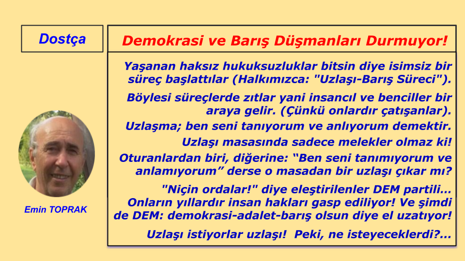 “Niçin ordalar!” diye eleştirilenler DEM partili… Yıllardır onların insan hakları gasp ediliyor! Ve şimdi de DEM: demokrasi-adalet-barış olsun diye el uzatıyor!